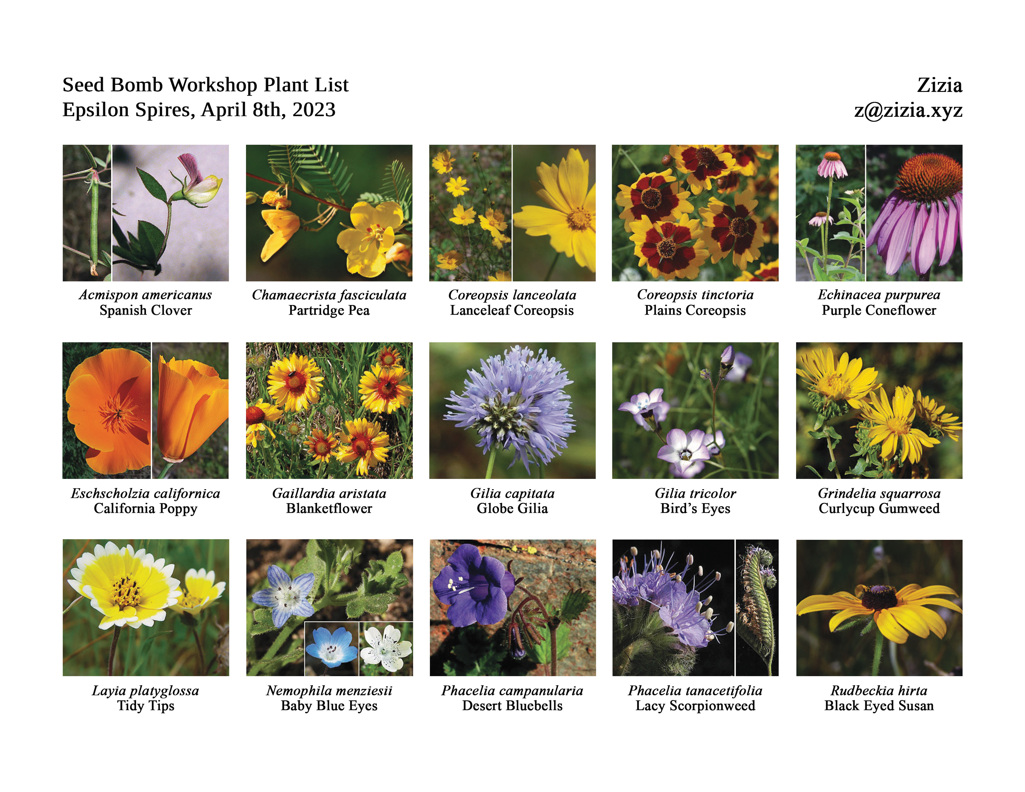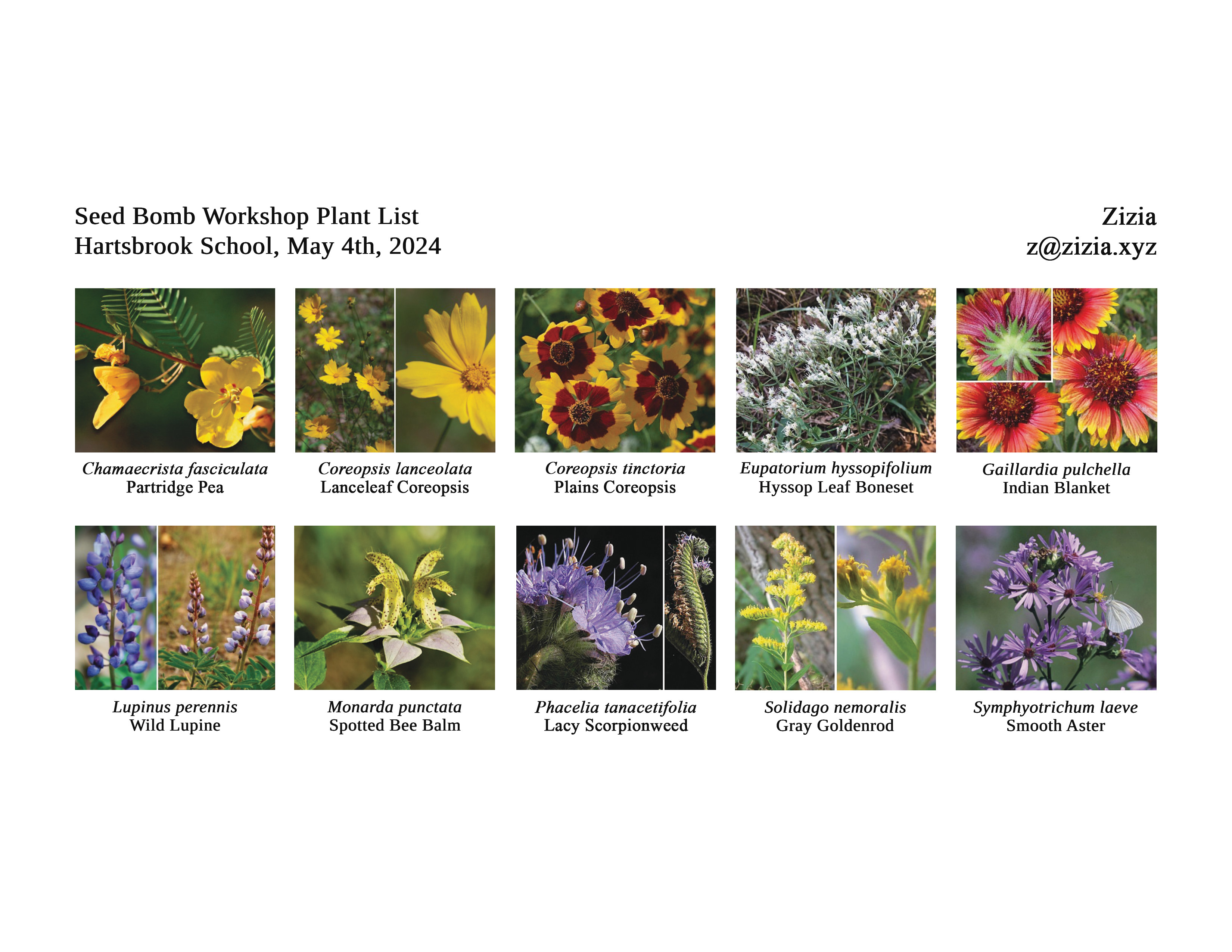 Zizia seed bombs are composed of annual and perennial wildflowers who are native to the United States. Wildflowers that feed native pollinators, particularly Bumble Bees (Bombus spp.), are prioritized. The following species are drought-tolerant, grow in gravelly or sandy soil, prefer full sun (≥ 6 hrs/day), and share benefits, including cut flowers, dyes, and medicines:
